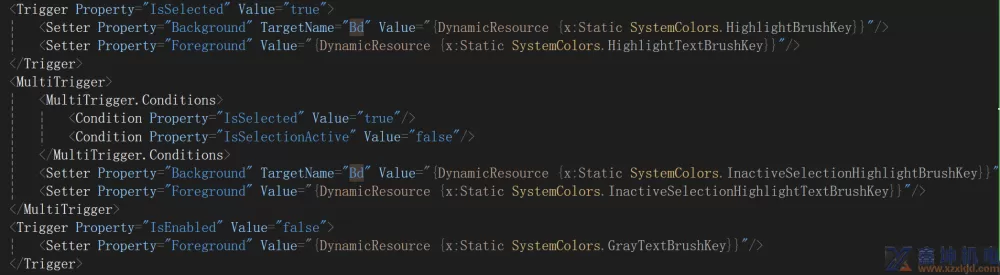 我们取名为bd1的border,最开始的Visibility设置的是Hidden,我们替换一下关于Bd的trigger,让它变成当IsSelected是true的情况下,让bd1的Visibility变成Visible.