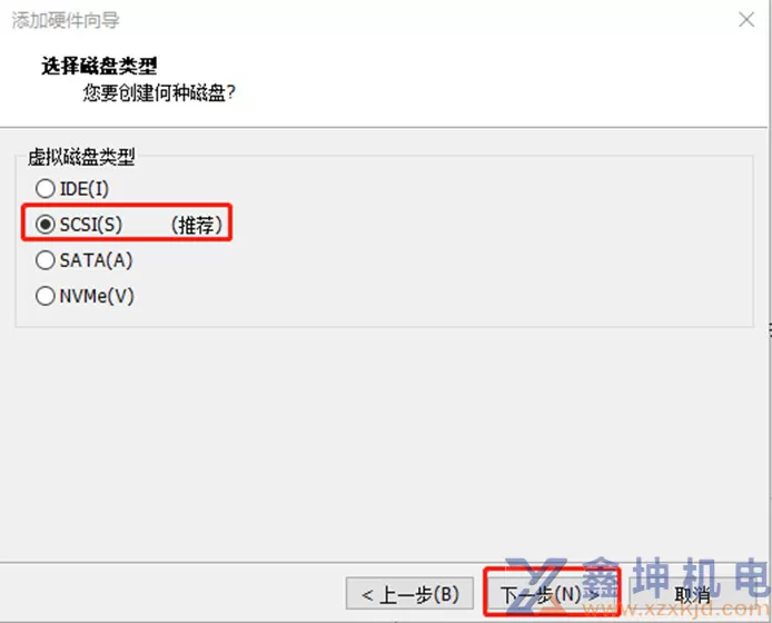 弹出磁盘类型对话框,我们勾选“SCSI(S) (推荐)”然后点击“下一步”