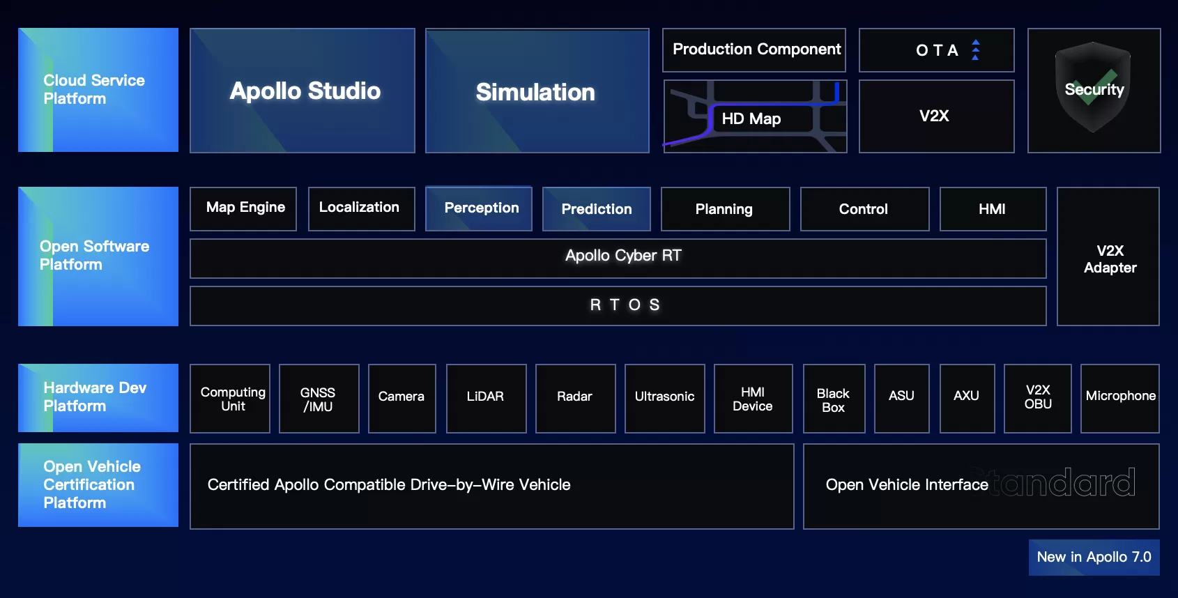 Apollo 7.0 incorporates 3 brand new deep learning models to enhance the capabilities for Apollo Perception and Prediction modules. Apollo Studio is introduced in this version, combining with Data Pipeline, to provide a one-stop online development platform to better serve Apollo developers. Apollo 7.0 also publishes the PnC reinforcement learning model training and simulation evaluation service based on previous simulation service.